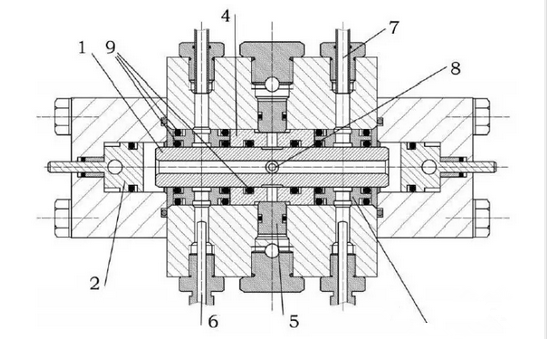 -活塞桿 2-行程加載活塞 3-襯套 4-偏載襯套 5-偏載活塞 6-溫度測量評(píng)價(jià)系統(tǒng) 7-泄漏量評(píng)價(jià)系統(tǒng) 8-注油孔 9-測試試樣