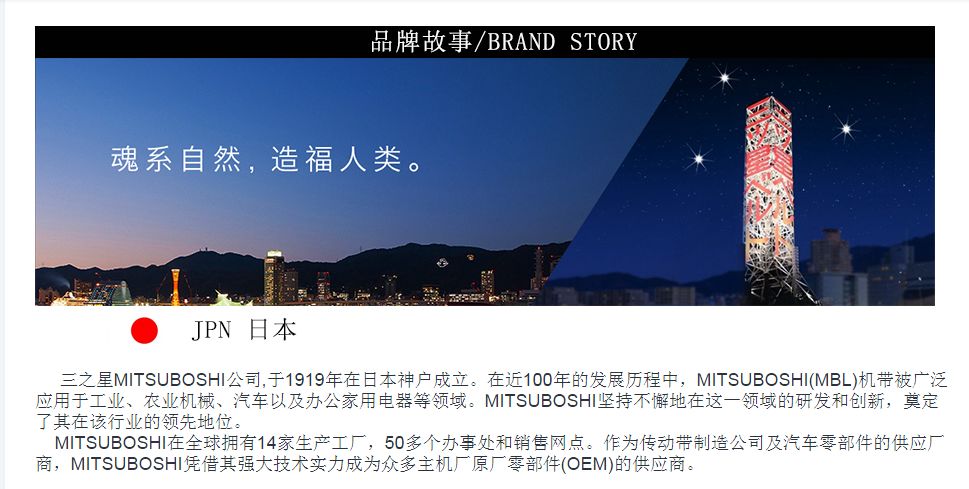 1919年,在日本神戶,三之星作為工業(yè)皮帶的專業(yè)制造商正式成立。百年的風(fēng)雨兼程,雖歷盡滄桑,但仍充滿朝氣;百年的斗轉(zhuǎn)星移,雖千變?nèi)f化,但仍初心不改。 百年前的破殼 讓三之星從無到有 百年間的創(chuàng)造 讓三之星如日中天 沾百年之福,成無憂生產(chǎn) 在100年的發(fā)展歷程中,MITSUBOSHI堅持不懈地在這一領(lǐng)域的研發(fā)和創(chuàng)新,奠定了其在該行業(yè)的領(lǐng)先地位。為適應(yīng)未來世界的需求,更加積極向更高技術(shù)挑戰(zhàn),為滿足人們的生活、豐富社會提供新產(chǎn)品。 三星皮帶為滿足各種苛刻的汽車開動條件而設(shè)計開發(fā)的高品質(zhì)傳動帶,具有壽命長,無需維修的特點(diǎn)。利用新生產(chǎn)工藝,在一定程度上能夠很好的減少噪音,增強(qiáng)耐磨性,提高耐久性。并能減輕車輛承受的負(fù)荷,以此達(dá)到省油的效果。 三之星皮帶產(chǎn)品多樣,可用范圍廣,產(chǎn)品包含:一般產(chǎn)業(yè)用機(jī)帶、辦公家用電器用機(jī)帶、農(nóng)業(yè)機(jī)械用機(jī)帶、汽車用機(jī)帶,廣泛應(yīng)用于工業(yè)、農(nóng)業(yè)機(jī)械、汽車以及辦公家用電器等領(lǐng)域,質(zhì)量有保證,使用更安心,讓用戶無后顧之憂。